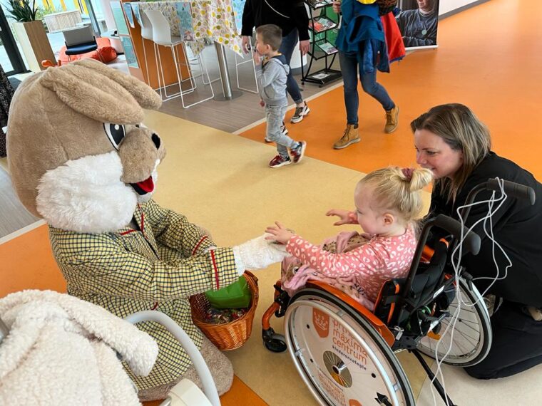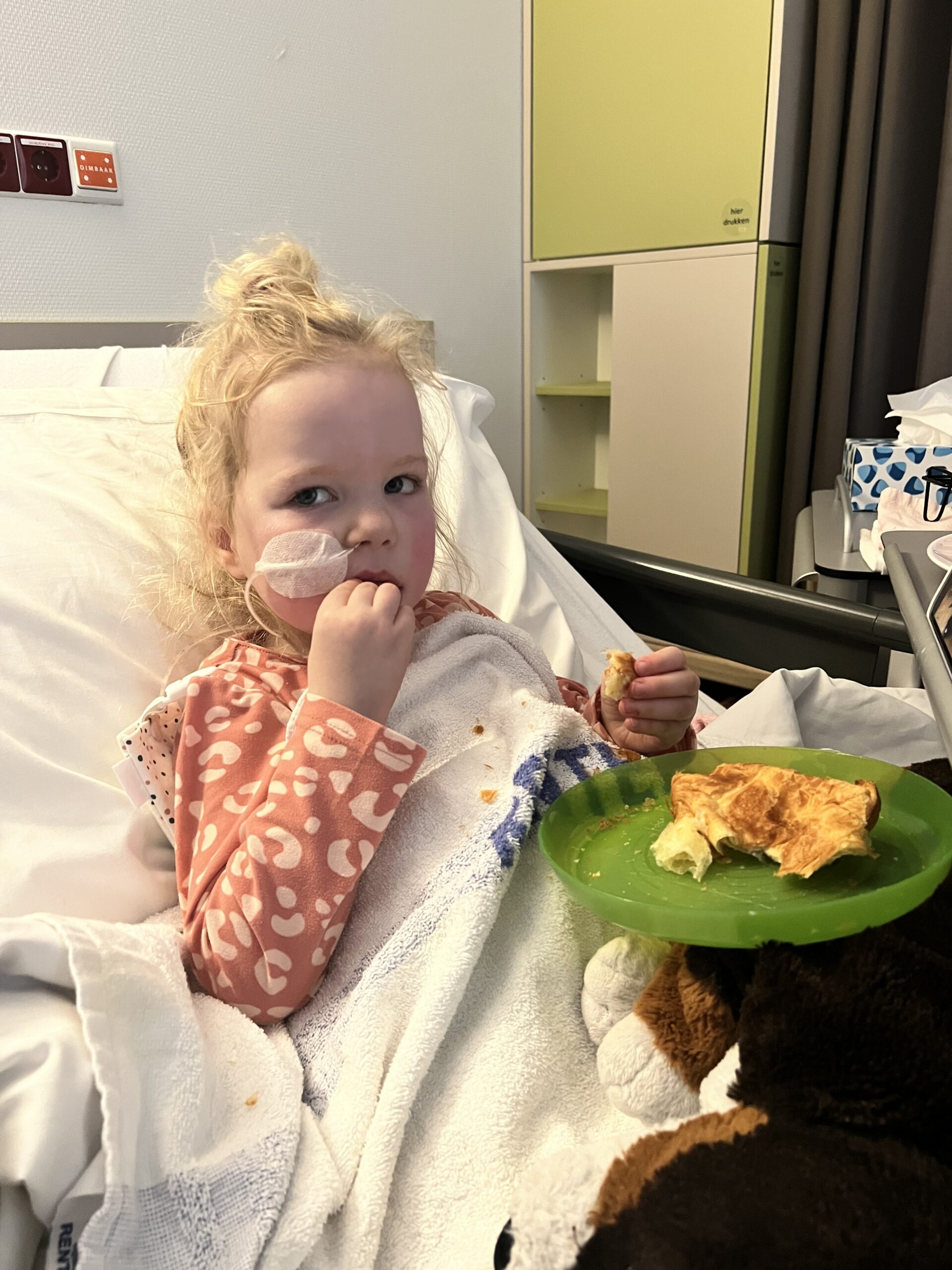 Het eerste kregen we, ze sliep de hele nacht als een blok! Het tweede helaas niet. De dag erna waren de plekjes in haar mond uitgebreid en de pijn nog steeds niet onder controle. Zorgwekkend want door de verminderde weerstand kon Maxime haar lichaampje dit virus zelf niet aan. Na overleg met het PMC werden we verzocht maar het PMC te komen en werden we opnieuw opgenomen. En zo brachten we Pasen ‘23 door in het PMC.