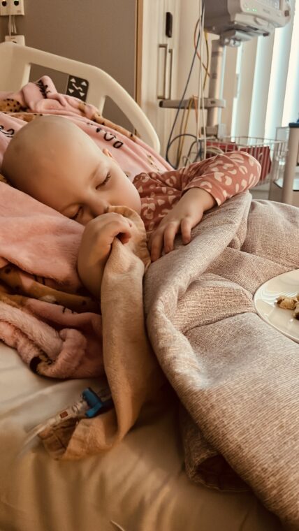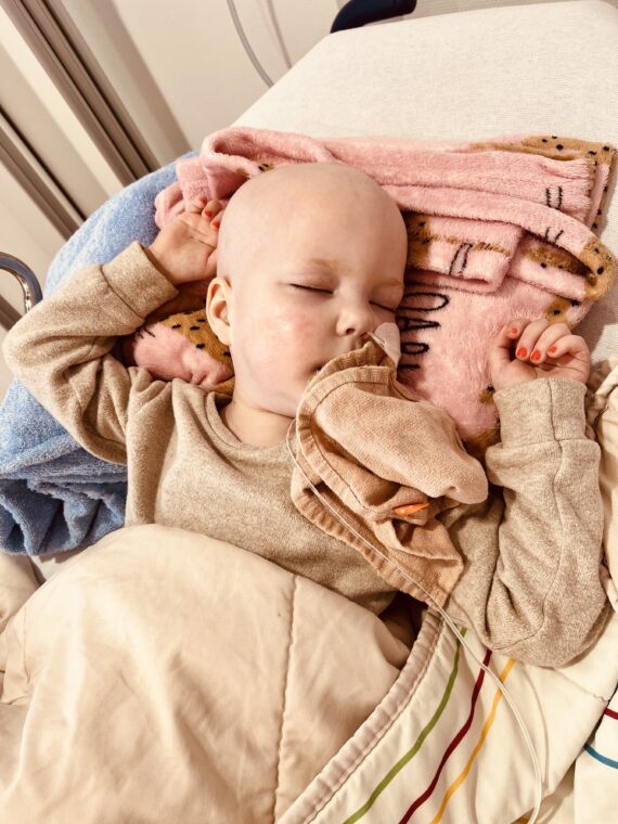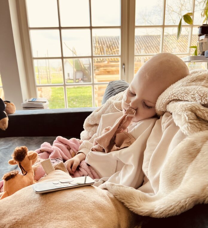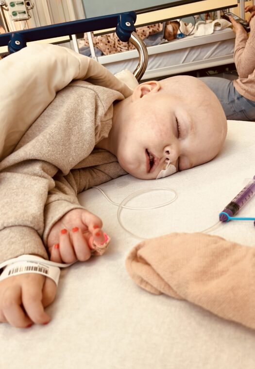 We hadden hierover contact met het PMC, en in overleg besloten we dit even aan te zien. Zo lang als het geen hoge koorts werd was het acceptabel en hoopten we dat het vanzelf over zou gaan. Op 2 mei gingen we dan toch, omdat de koorts maar niet weg ging en zelfs opliep voor een extra check naar het Vie Curi, hier werd ervoor gekozen om geen vingerprik te toen maar meteen de PAC aan te prikken omdat het er dik in zat dat er later antibiotica via de PAC gegeven zou gaan worden, dus vandaar ook meteen de bloedafname via de PAC. De uitslag van deze bloedafname leidde zoals al verwacht tot een opname, een veel te laag HB waar voor een bloedtransfusie nodig was, Neutrofielen lager dan 0,1 (dus extreem lage weerstand) en de aanhoudende koorts, waarvoor direct gestart ging worden met Antibiotica via de PAC. ( minimaal 3 dagen) Hoppa, daar gingen we weer, de volgende spoedopname, thuis zijn en even op adem komen werd ons niet gegund, en dat terwijl bij de start van de behandeling was uitgelegd dat we enkel en alleen twee keer per week dagbehandeling zouden hebben in de eerste 6 weken…. we leerden hierdoor wel heel snel dat “plannen” onmogelijk is een dergelijke ziekte/behandelproces.