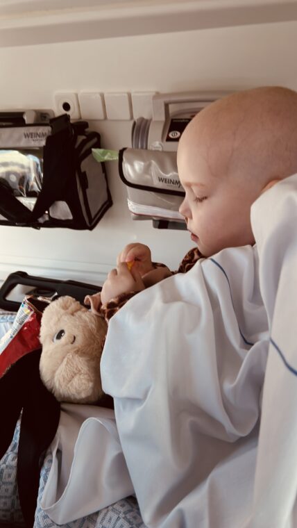 Op 19 april werden we overgeplaatst naar het PMC per ambulance. Inmiddels was de diarree ver gestopt maar op dit soort momenten wordt er toch gekozen om laagdrempelig een ambulance transport in te zetten. Dat is op zich prettig, Maxime had het al eerder meegemaakt en was er relaxed onder en sliep eigenlijk zo goed als de hele reis. Ik zat alleen met haar achterin en de verpleegkundige en chauffeur hebben gewoon “gezellig” samen voorin kunnen zitten, die hadden tijd om even bij te kletsen. ik vond het zelf daarentegen een confronterend ritje waarbij je teveel tijd hebt om na te denken en te realiseren dat je, en waarom je, met je kleine meisje in een ambulance zit. Eenmaal in Utrecht aangekomen werden deze gedachten snel verdrongen en gingen we weer over tot de orde van de dag, blik op oneindig en “gaan”