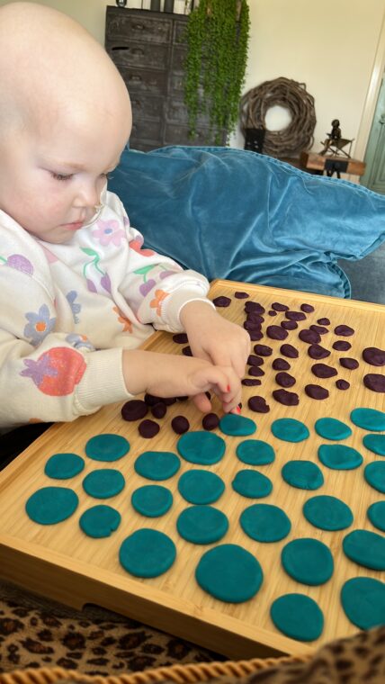 Maxime vulde haar dagen in deze tijd met het oneindig rollen van bolletjes klei, het ene na het ander potje, zonder woorden, alleen maar bolletjes draaien om ze daarna plat te drukken, bij elkaar te gooien, een grote bal te maken en weer van voren af aan beginnen. (urenlang…) Daarnaast was het zelf knippen van confetti een favoriete bezigheid, op de vreemdste plekken, liefst op een tennisracket op de grond op de mat in de speelkamer, om ze vervolgens met het racket in de lucht te gooien.