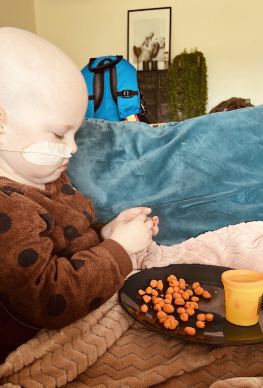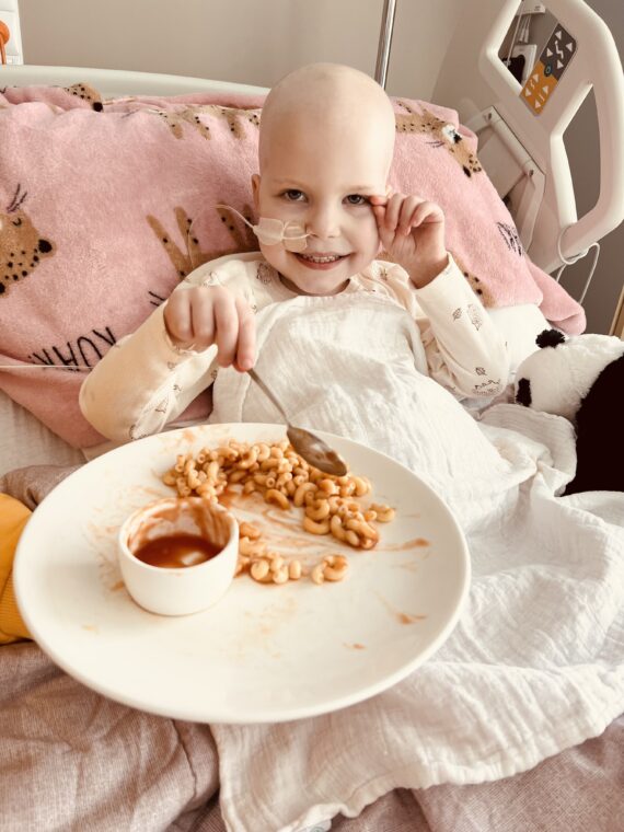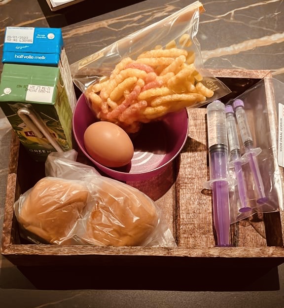 En naast deze bezigheden waren we nog steeds de hele dag en nacht bezig met het zoeken naar eten. Ze wilde de hele tijd van alles, maar wist niet “wat precies” tomatensoep, crackers en rijstwafels met smeerkaas en mais waren wel haar lievelings… en ‘s-nachts wilde ze melk, ice tea, chips, zachte broodjes en gekookte eieren (vooral het zelf pellen ) dus we gingen met hele dienbladen vol voor op het nachtkastje naar bed. Ja, dit klinkt echt bizar en als gekkenwerk, maar met Dexamethason kom je in zo’n rare andere wereld terecht dat je zelfs dit gaat accepteren. 🙁 Dan heb ik het nog niet over de “piccolino pizzatjes” die we midden in de nacht gebakken hebben…..