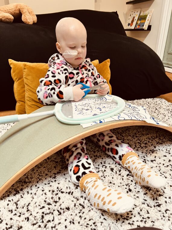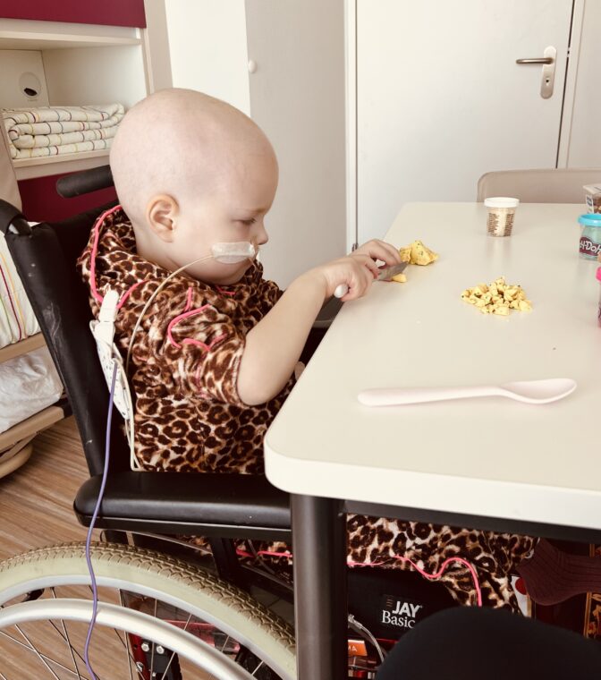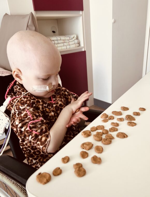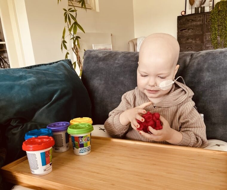 Maar terug naar de toedieningen van de Ara-c. Maxime haar port-a-cath was aangeprikt in het PMC en ze is met het naaldje aangeprikt mee naar huis gekomen. Er kwamen daarna 4 dagen achter elkaar iedere dag andere verpleegkundigen van de kinderthuiszorg. Allemaal even lief en geduldig met Maxime, wat ook echt noodzakelijk was want ze liet niet veel toe. Ze moesten een voor een eerst zorgen dat ze ontdooide en hun meegenomen “toverstaf” aan Maxime overhandigen en dan kwam langzaam het moment dat ze de chemo konden toedienen. Twee van de dames hebben denk ik zeker een half uur zitten bolletjes te draaien van klei samen met Maxime, kortom “alles om het ijs te breken”.
