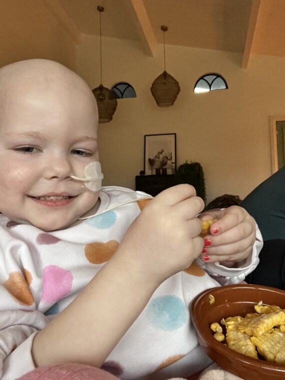 We waren 4 nachten in Venlo, (Ik bleef de nachten en overdag was Bart er ook waar mogelijk, of hij was thuis met Fleur. Bij aankomst in Venlo bleek Maxime al “uitgedroogd te raken” en werd er een infuus met vocht gestart. Ook werd er sondevoeding gestart, tot nu toe werd de sonde alleen nog gebruikt voor het toedienen van medicatie, maar omdat haar gewicht na al deze opnamen en diarree omlaag dook van 16,5 kg naar 13,9 op het dieptepunt, moest ze bijvoeding krijgen. Ze vroeg weliswaar de hele dag om eten, maar at overal maar hele kleine hapjes van en al helemaal geen goede gezonde bouwstoffen binnen.