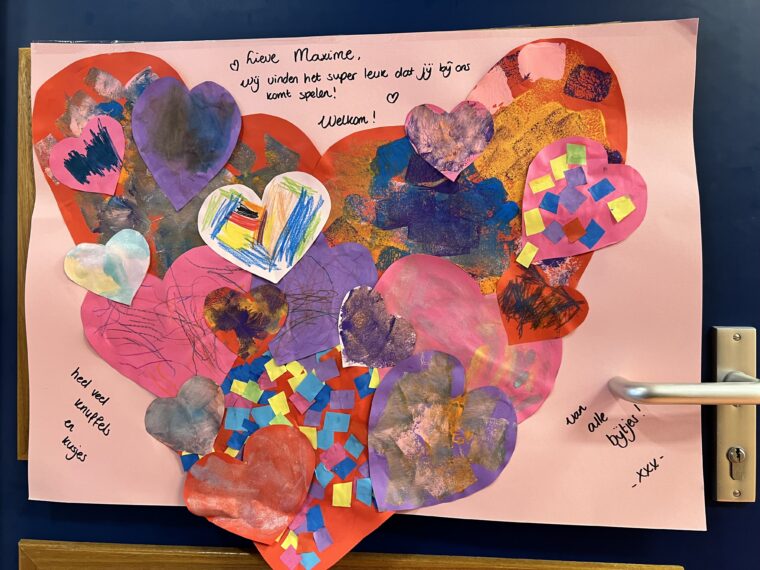 We waren wel beiden zo zenuwachtig dat we het prachtige kunstwerk dat de kindjes gemaakt hadden om Maxime welkom te heten totaal over het hoofd zagen. (Sorry lieve kindjes en dames!!) Maar eenmaal binnen was Maxime niet minder snel ontdooid dan “normaal”. De bekende gezichtjes en gezichten waren al snel weer vertrouwd en ze voelde zich al snel veilig genoeg om te spelen en ging op ontdekking naar al het speelgoed.