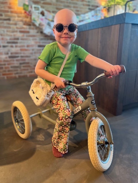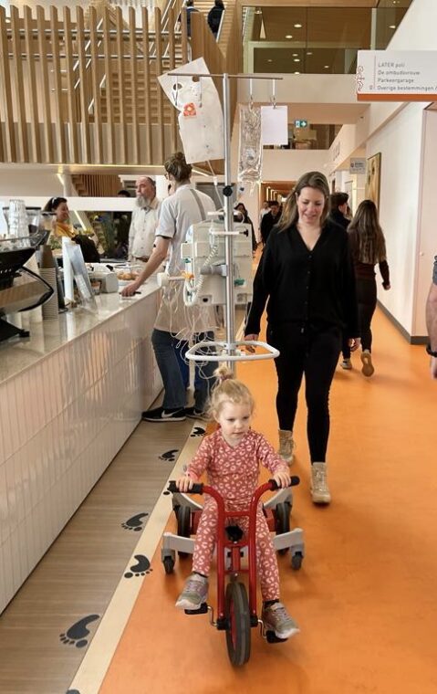 Er werd ons ook verteld dat er een paar dingen zijn waarover kindjes van deze leeftijd tijdens deze behandeling wel nog zelf controle hebben, ze moeten natuurlijk heel veel laten gebeuren tijdens deze behandeling en hierbij volledig de controle uit handen geven. Twee dingen waar ze zelf wel nog altijd iets over te zeggen hebben is, of ze willen lopen en of ze willen eten. En dat zagen we bij Maxime duidelijk terug. (natuurlijk los van het aandeel wat de medicatie daarin had) Vanaf april hadden we dan ook een meisje dat helemaal niet meer liep, waar we toch ergens bang van werden. Komt dit echt vanzelf weer goed, zoals artsen wel zeiden? Het voelde voor ons alsof we een kindje hadden met verlamde benen. Je zag de beentjes voor je neus ook dunner worden. Aan het begin van het tweede blok (eind april) riepen we de fysio toch in consult. We hadden in onze eerste dagen al kennis gemaakt met hem, Maxime kreeg toen van hem de eer om een prototype van een fietsje waar de infuuspaal aan vast gemaakt kon worden te mogen proefrijden door het PMC. Met veel bekijks van o.a. de sponsoren van dit prachtige initiatief.