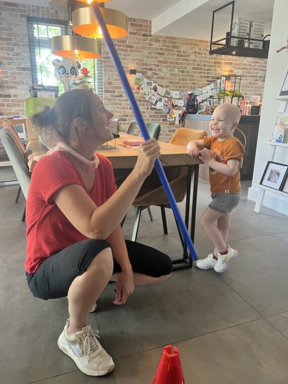 Gelukkig bracht hij wel ook geruststelling en bevestigde ook wat al eerder gezegd was. En na wat kleine testjes gaf hij aan gerustgesteld te zijn omdat hij zag dat ze toch nog behoorlijk wat kracht in haar voetjes bleek te hebben en dat toch echt de verwachting was dat dit vanaf nu langzaam maar zeker zou gaan bijtrekken. We zaten nu volgens hem dan ook op het dieptepunt. Vanaf nu zou “de lijn” weer omhoog moeten gaan. Eind mei gingen we van start met Fysio thuis, om zo beter samen aan het herstel te kunnen werken. Tijd zat voor thuis, dus kom maar op!!