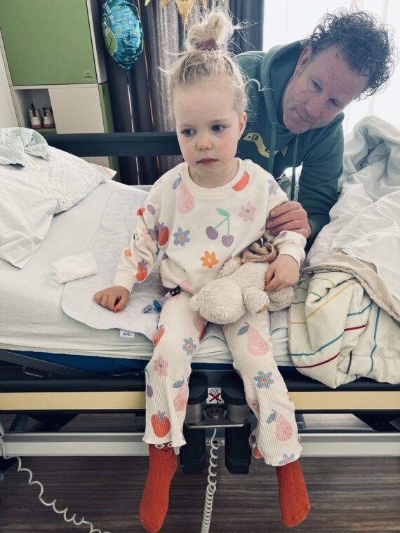 Na de weken vooraf aan de diagnose die voor Maxime gepaard gingen met pijn met als gevolg dat ze soms aangaf niet te willen lopen, volgden er na de diagnose een paar pittige dagen met behandelingen en een operatie voor het plaatsen van de port-a-cath. Ze had duidelijk “ingeleverd” en was heel teruggetrokken, en nu toch echt een heel ziek meisje geworden. Als ik naar de foto’s kijk van deze dagen ben ik blij dat ik dit op het moment zelf niet zo duidelijk gezien heb als op deze foto.