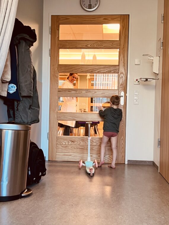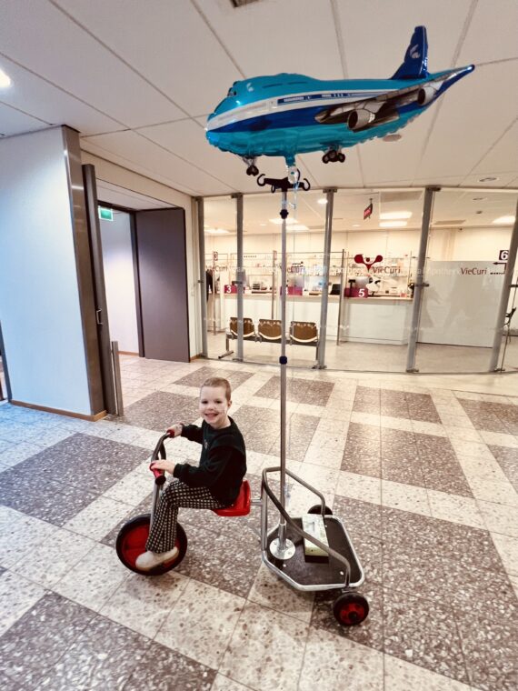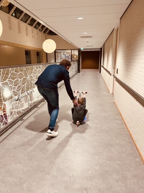 Isolatie met een klein meisje van 3 hadden we al eerder meegemaakt in Venlo, maar ik moet meteen erbij zeggen dat ( een heel ziek) meisje van 3 en een “relatief ziek” meisje van 4 echt weer een nieuwe dimensie is. Waar Maxime vorig jaar nog makkelijk bezig te houden was op een kamer, hebben we nu een kleuter die zuchtend in bed zit, “wat is dit saaaaaaaiiiiiii” roept de hele dag en wel de hele dag bezig gehouden moet worden. Ze begrijpt niet voldoende waarom ze niet van de kamer af mag en wil steeds naar de speelkamer en fietsen over de afdeling, of naar de verpleging want dat heeft ze eigenlijk meestal wel kunnen doen als ze opgenomen was en er niet te slecht aan was. Helaas, deze keer dus niet, en dus trek je dan als ouder alles uit de kast om haar te entertainen zonder de hele dag aan een beeldscherm te zitten. Dat doe je met alle liefde en gaat prima, maar dat zijn wel heeeeeeeeele lange dagen….. In de avond probeerden we dan wel, als de afdeling rustig, en het ziekenhuis “verlaten” was, even een fietsje of step met haar te pakken en een rondje door het ziekenhuis te doen. het uitje van de dag zeg maar.