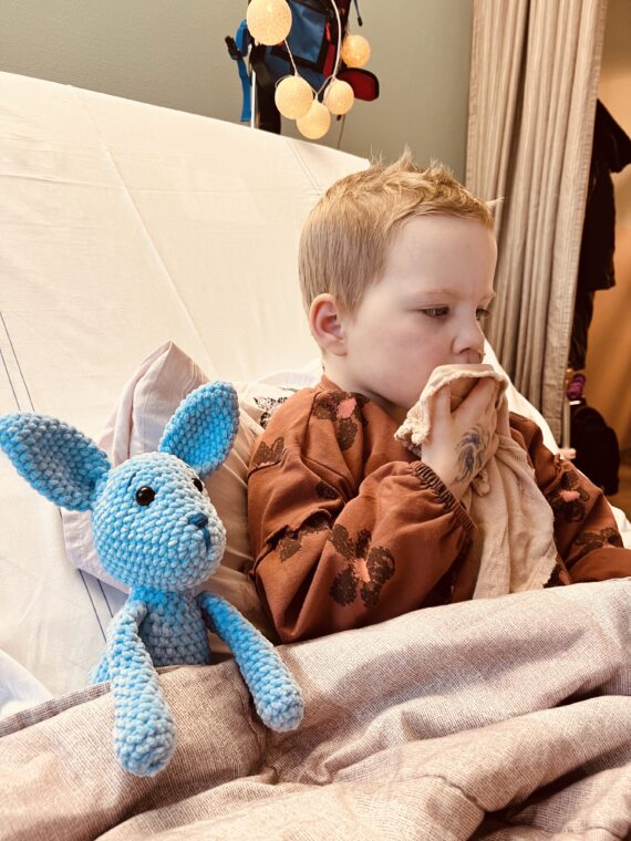Na wederom een onrustige nacht, waarbij ik al dacht dat ze wat warm aanvoelde, omdat ze door de onrust bij ons in bed had geslapen, nam ik in de loop van de ochtend haar temperatuur op. En jahoor, meteen 38,5 en bij de tweede keer meten een half uur later wederom. Dat betekent meteen PMC bellen en overleggen. Hierna volgde dan ook meteen het advies om Maxime te gaan laten beoordelen in het Vie Curi en meteen al definitief opname. En zo vertrok ik met Maxime naar Venlo. Daar aangekomen leek de koorts gezakt, vreemd genoeg want ik had herhaaldelijk gemeten, maar fijn natuurlijk, echter werd ze wel opgenomen, en naast de opname kreeg ze in de loop van de dag ook nog een isolatie bij haar opname. Dat betekent dat mensen die binnenkomen zich moeten beschermen, zij hebben dan een gele overjas aan en een mondkapje op en dragen handschoenen. Maxime zelf mag dan ook niet van de kamer af. Deze isolatie was voor ons nog een extra tegenvaller en kwam met name doordat ze zo nieste en de snottebellen door de lucht vlogen en ze nog niet zeker wisten of er geen besmettelijk virus aan ten grondslag lag wat besmettelijk kon zijn.